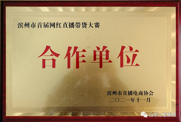 近日,“促進電商發展 助力鄉村振興”濱州市首屆網紅直播帶貨大賽暨濱州市身殘志堅達人直播大賽頒獎典禮隆重舉行。山東三星集團電商運營中心直播團隊憑借出眾的帶貨能力和業界影響力榮獲三等獎,并代表企業接牌特約“合作單位”榮譽獎牌。